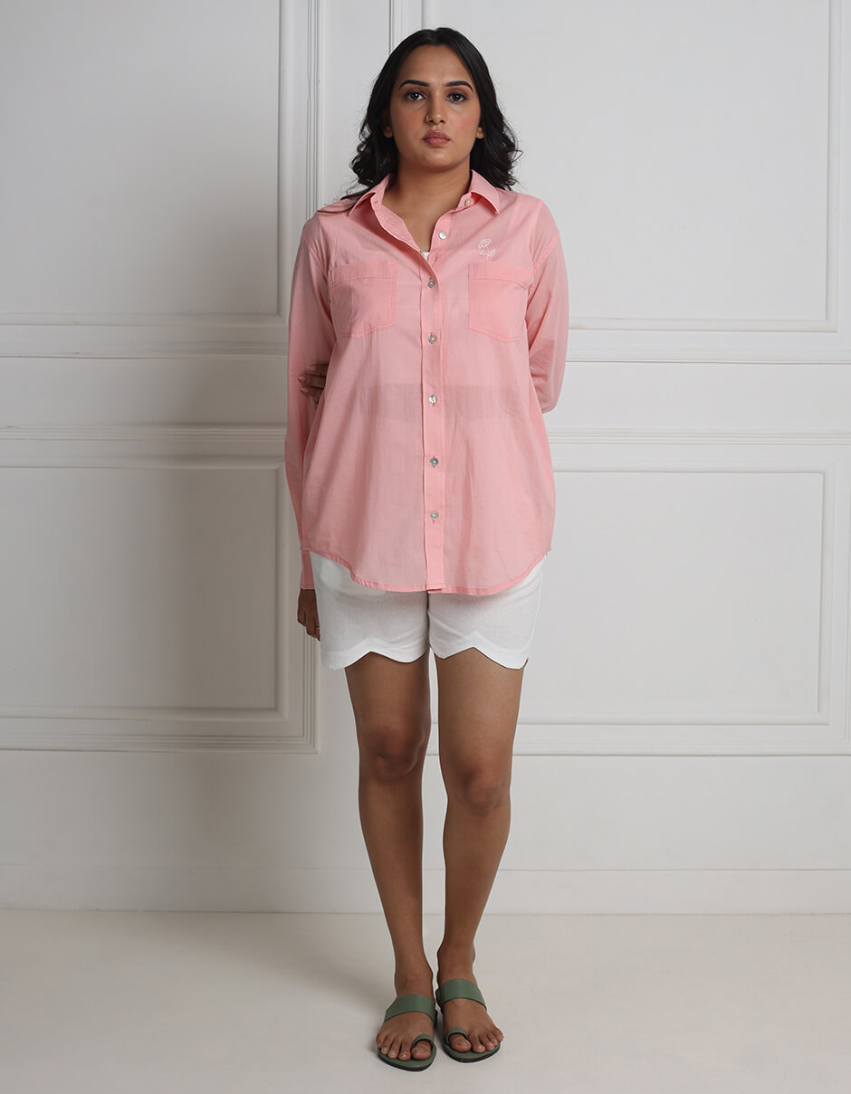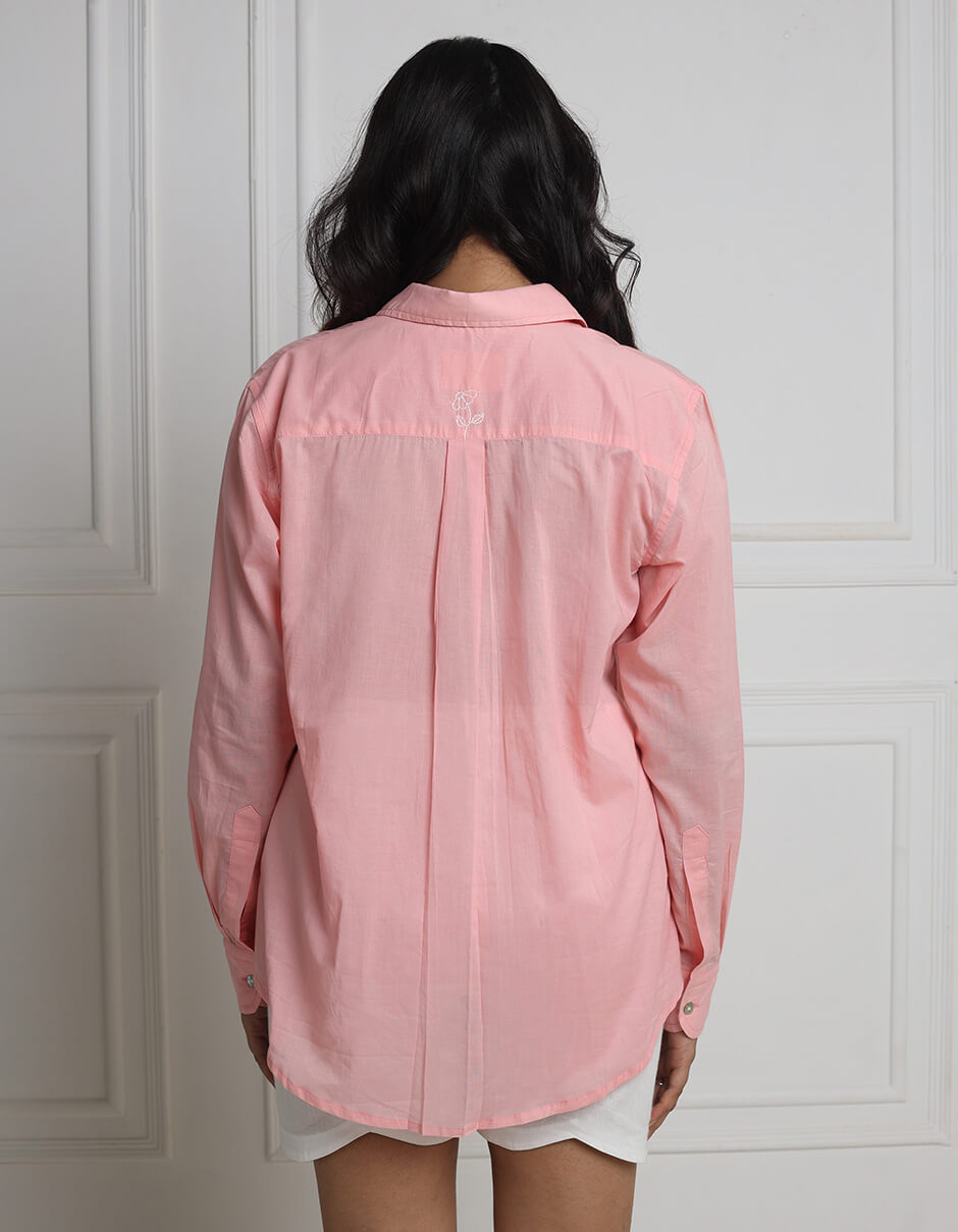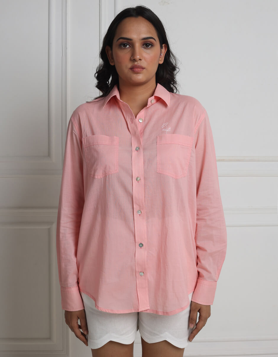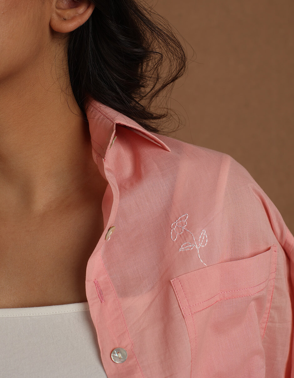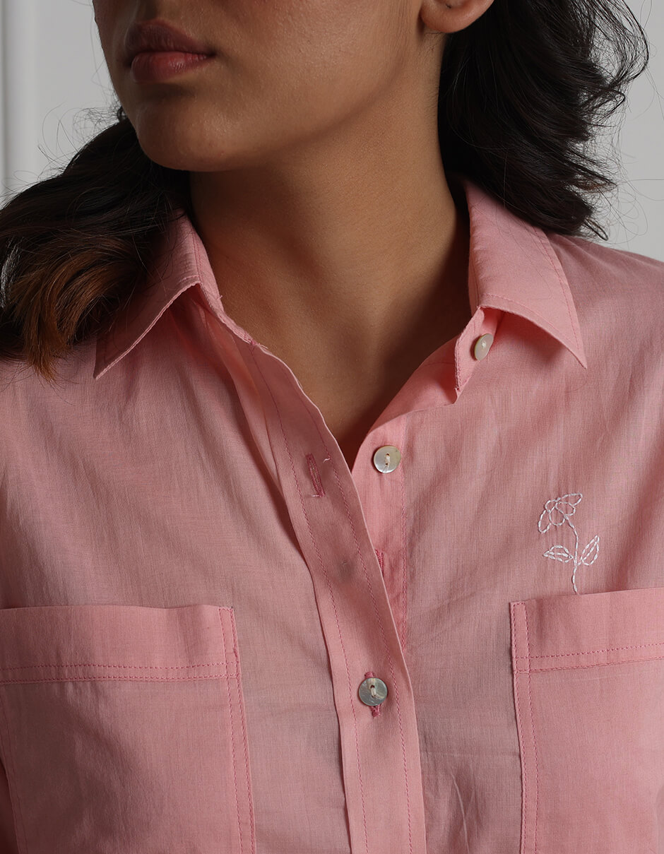 Cotton Front pocket collared Natural dyed easy fit shirt with hand embroidery in the front above the pocket and back yoke