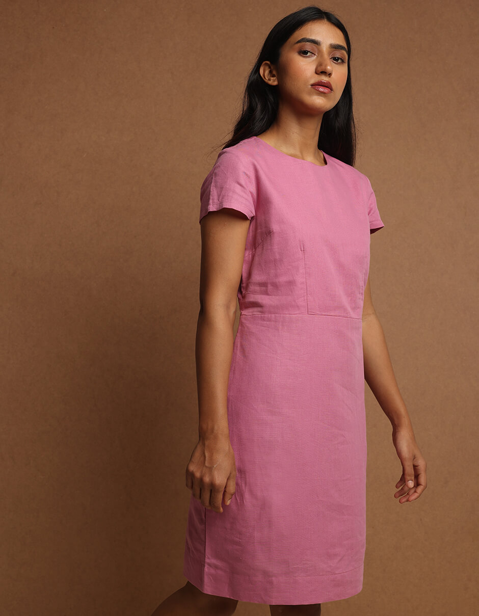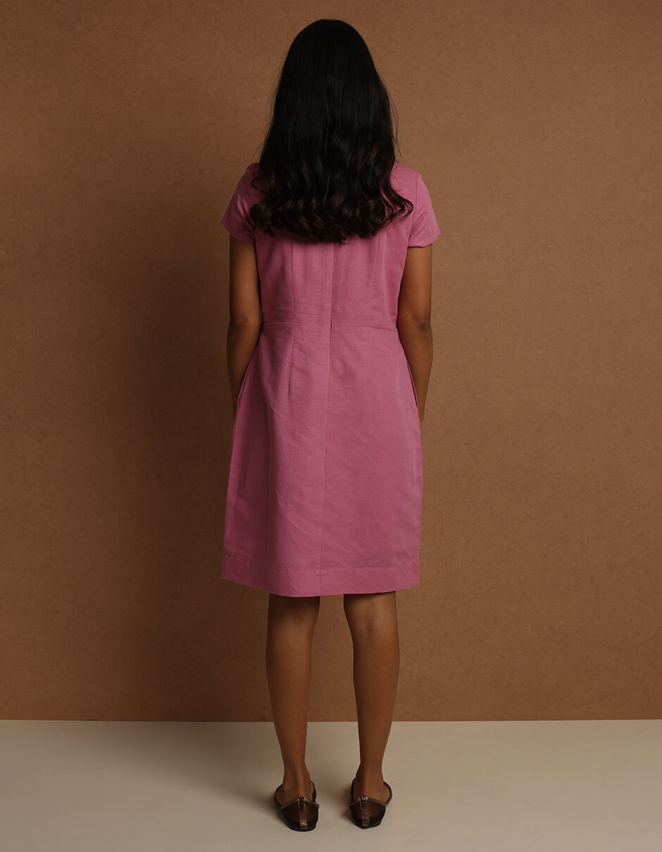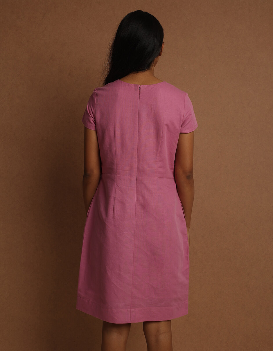 Natural-dyed pink cotton hemp dress with yoke and pocket.