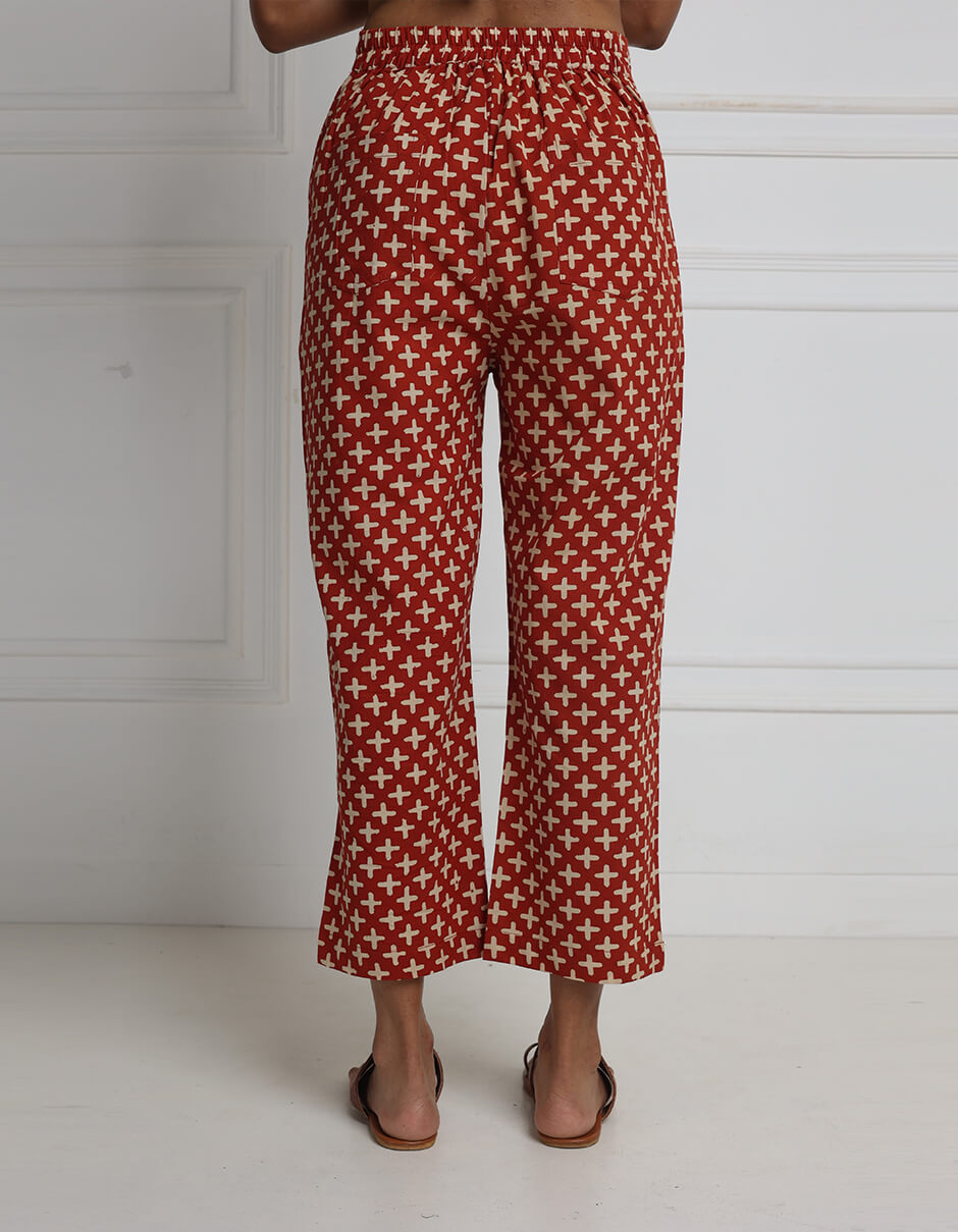 Cotton natural-dyed block printed ankle-length trouser. It has an elasticated back and pockets to carry your essentials.