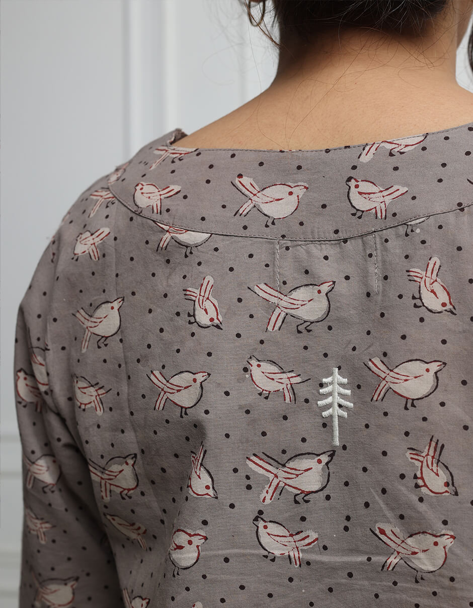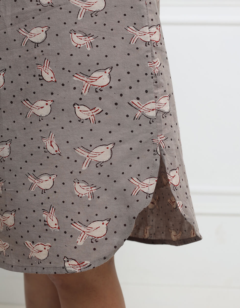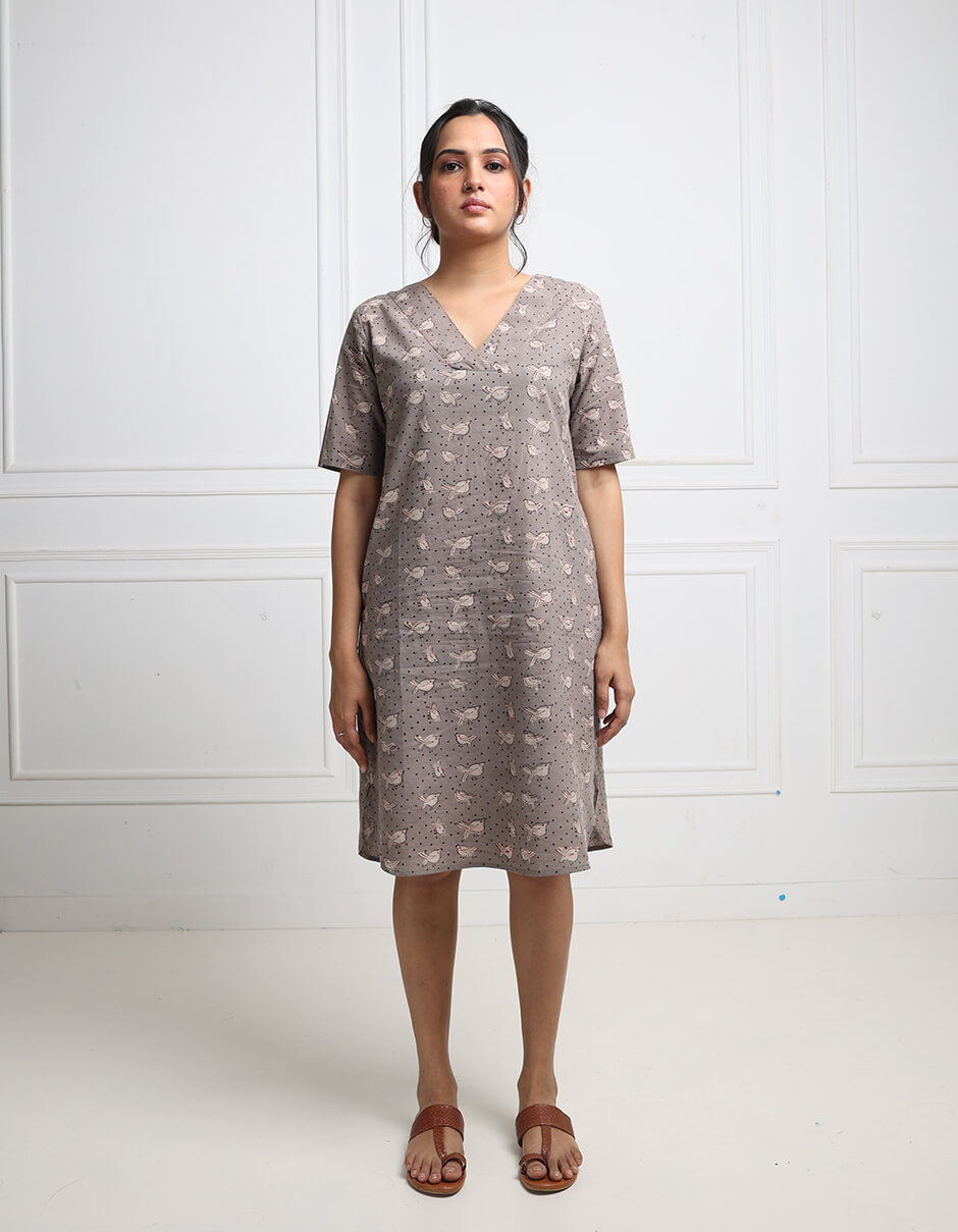 Natural dyed V neck hand block printed dress with an applecut hemline.