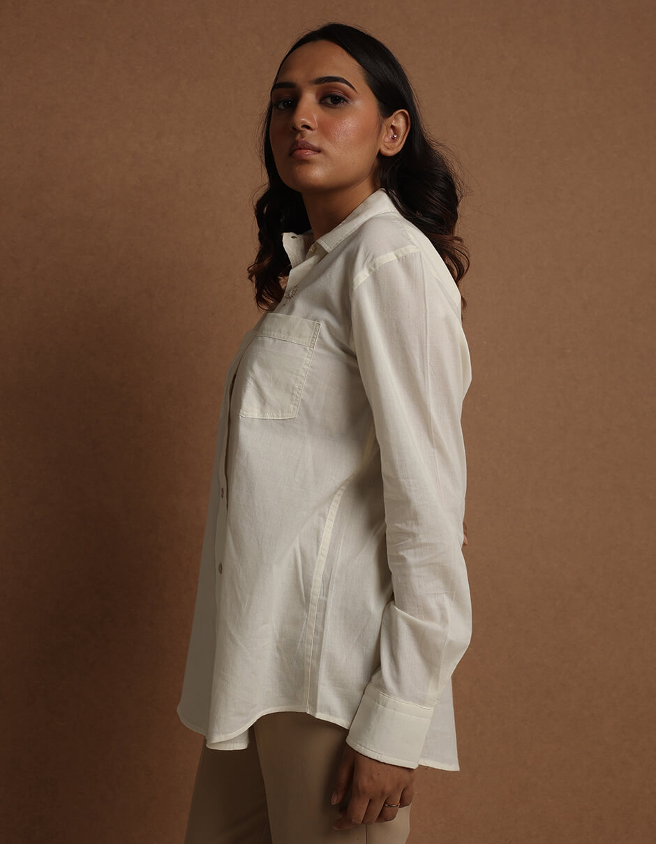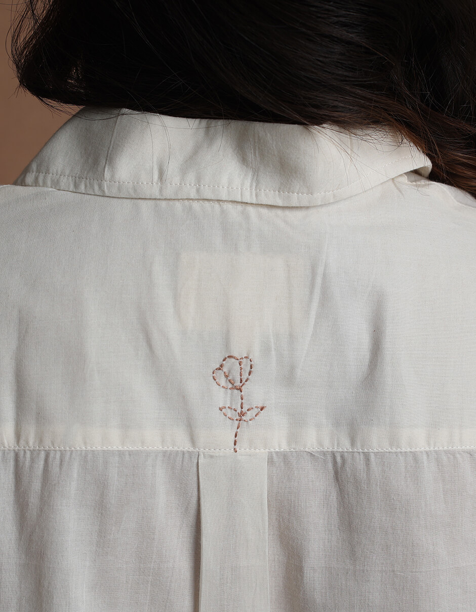 Front pocket Cotton collared Natural dyed regular fit shirt with hand embroidery in the front above the pocket and back yoke