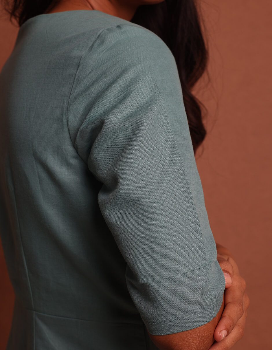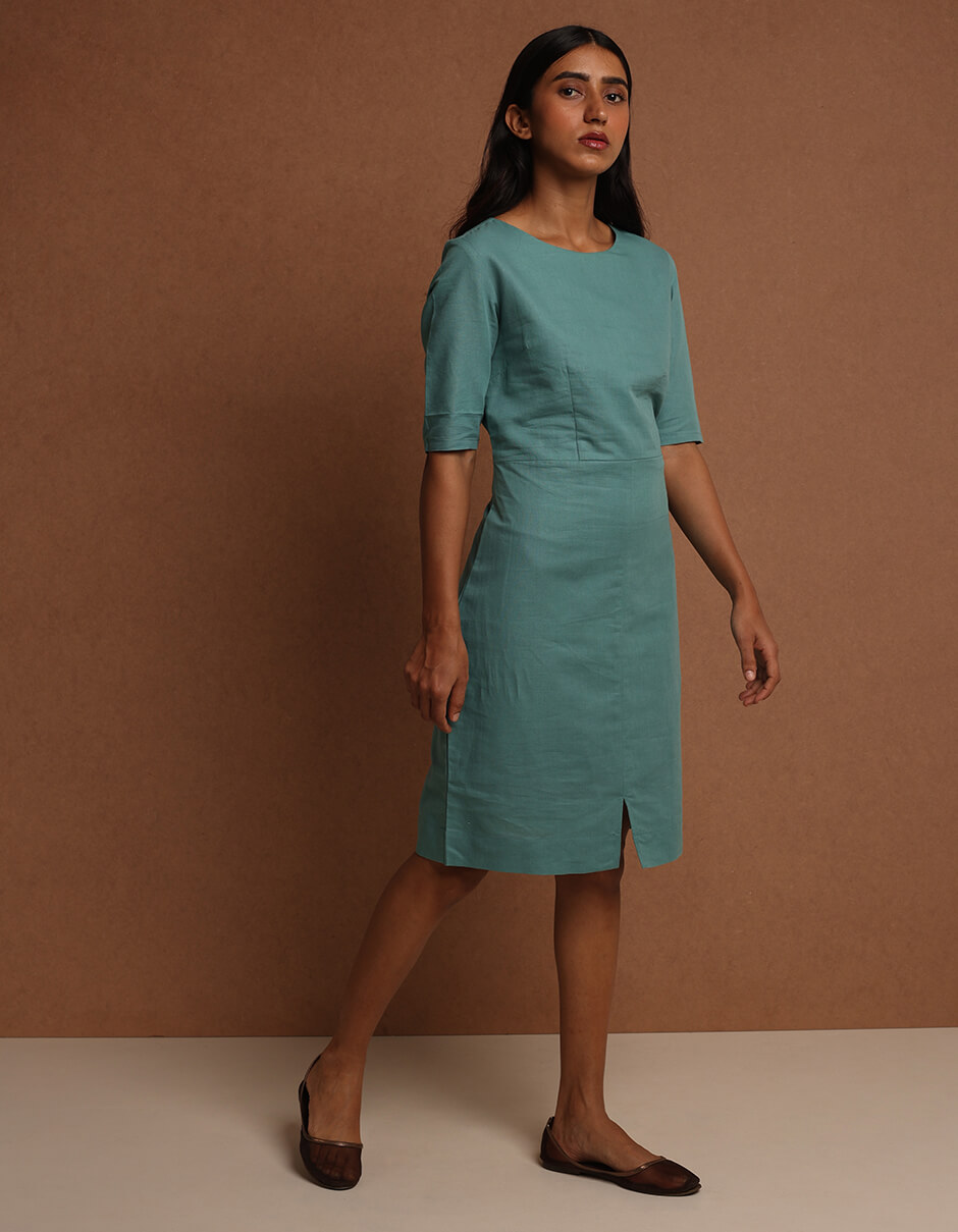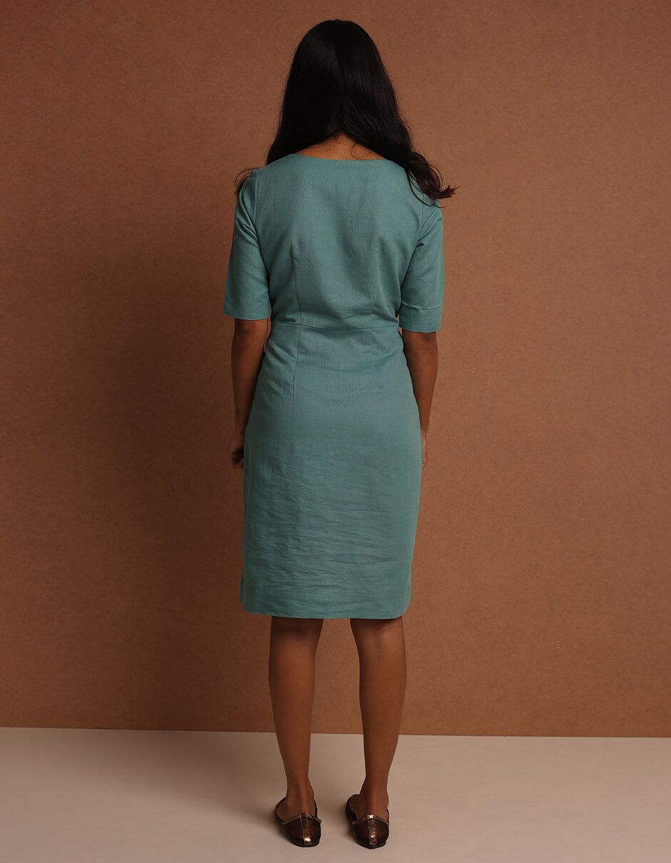 Natural Dyed Teal Cotton Hemp Dress with yoke, pocket and front slit