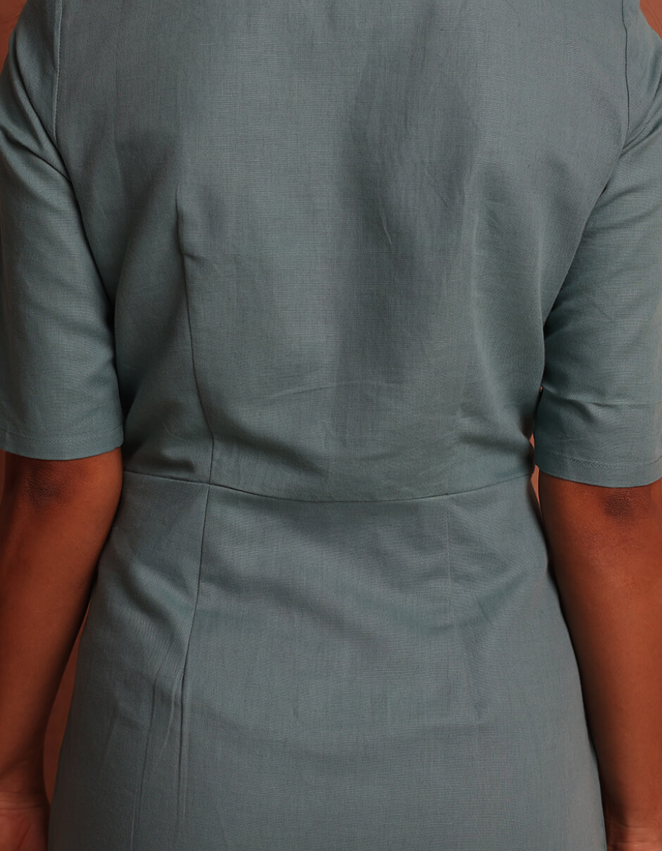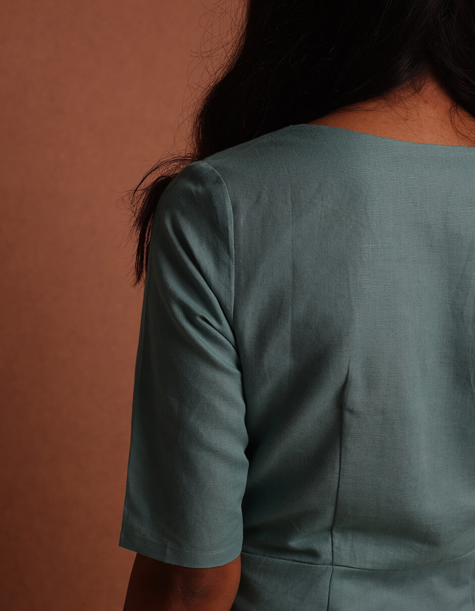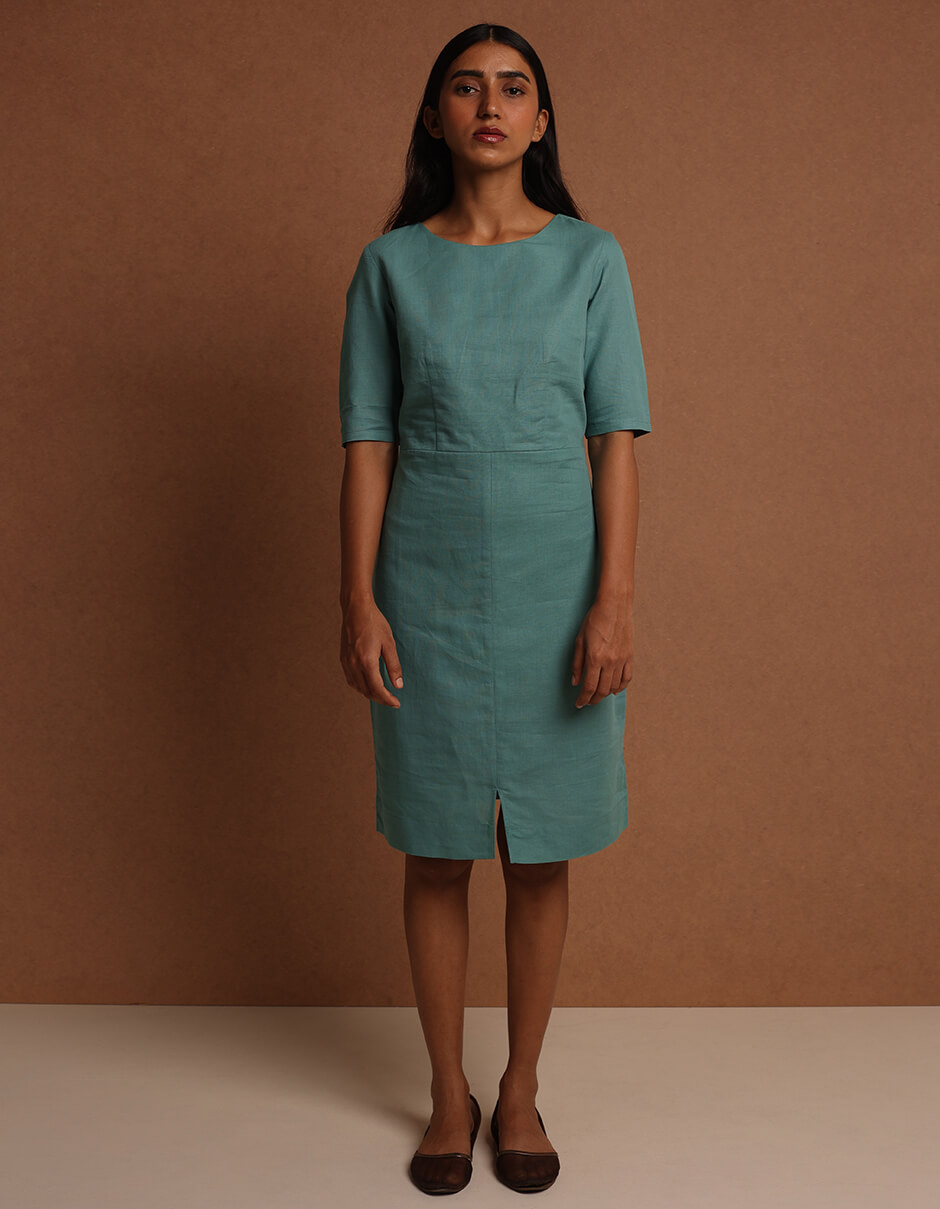 Natural Dyed Teal Cotton Hemp Dress with yoke, pocket and front slit